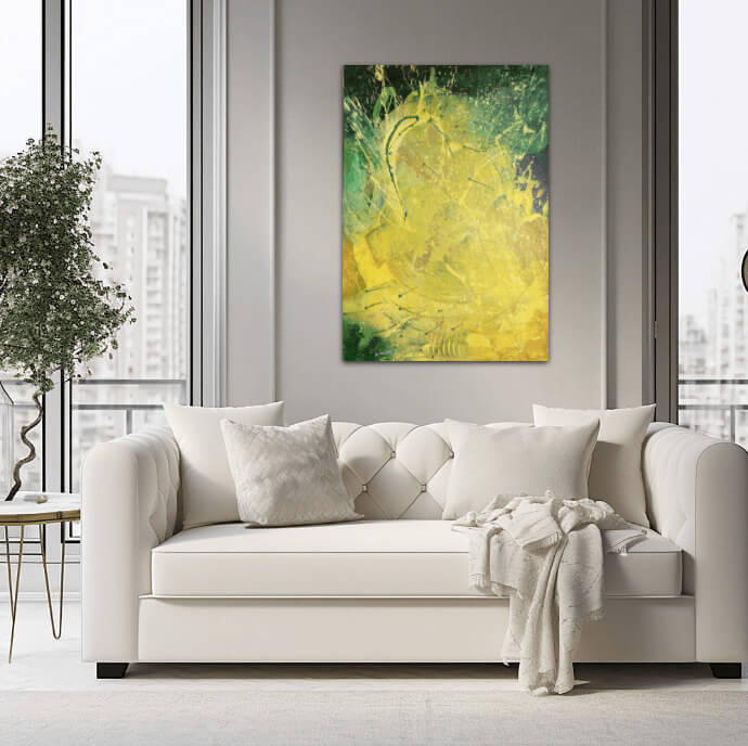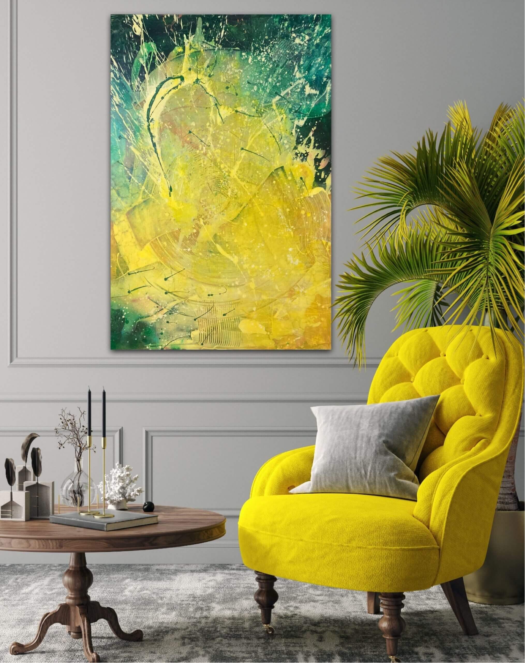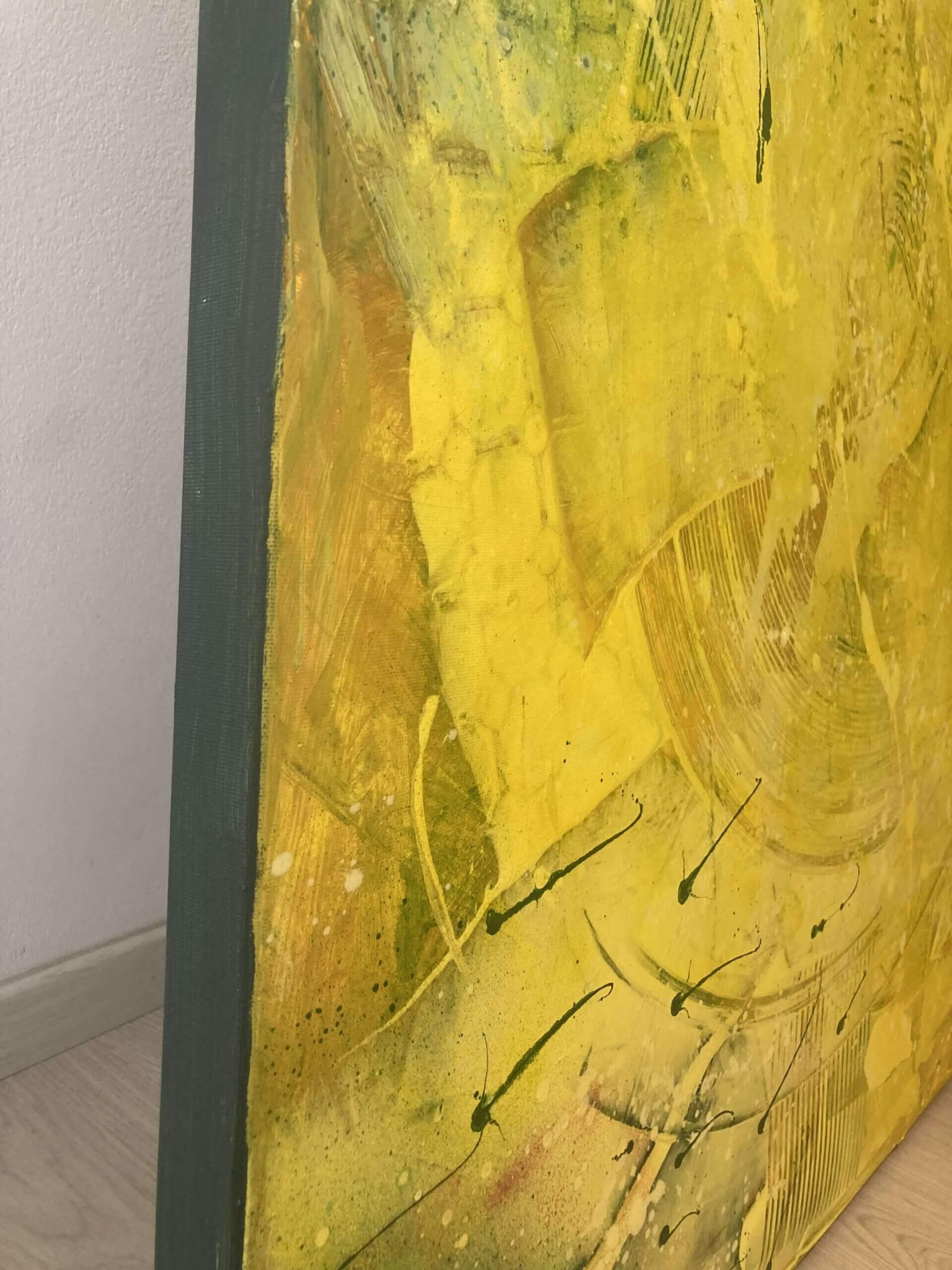Dílo vzniklo z potřeby zachytit okamžik radosti a vnitřní jasnosti. Žlutá symbolizuje světlo, tvořivost a novou energii. Obraz osloví diváka, který hledá vizuální stimulaci i emocionální kořen, impuls přímo do duše. V moderním interiéru se stane zdrojem pozornosti a vizuální harmonie.