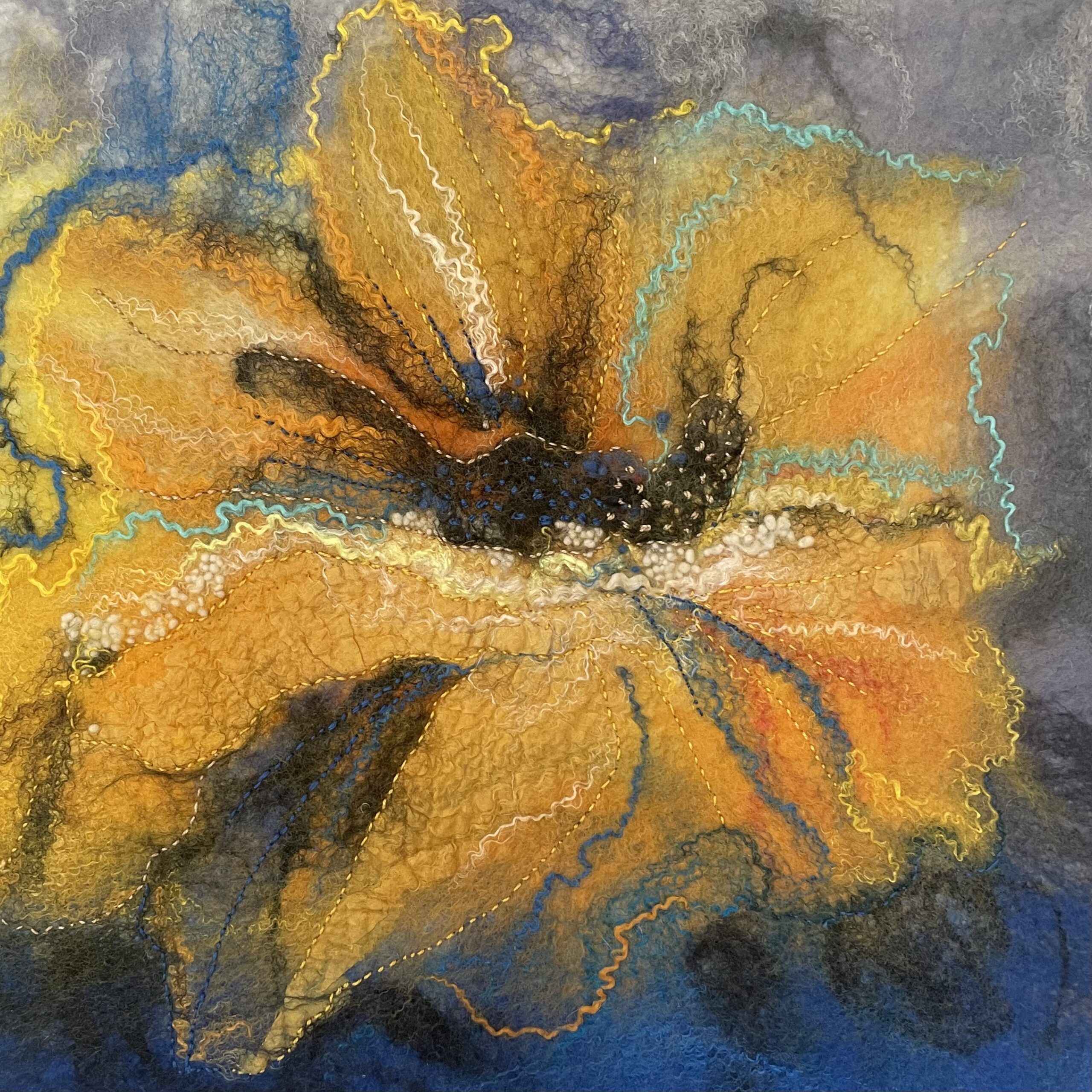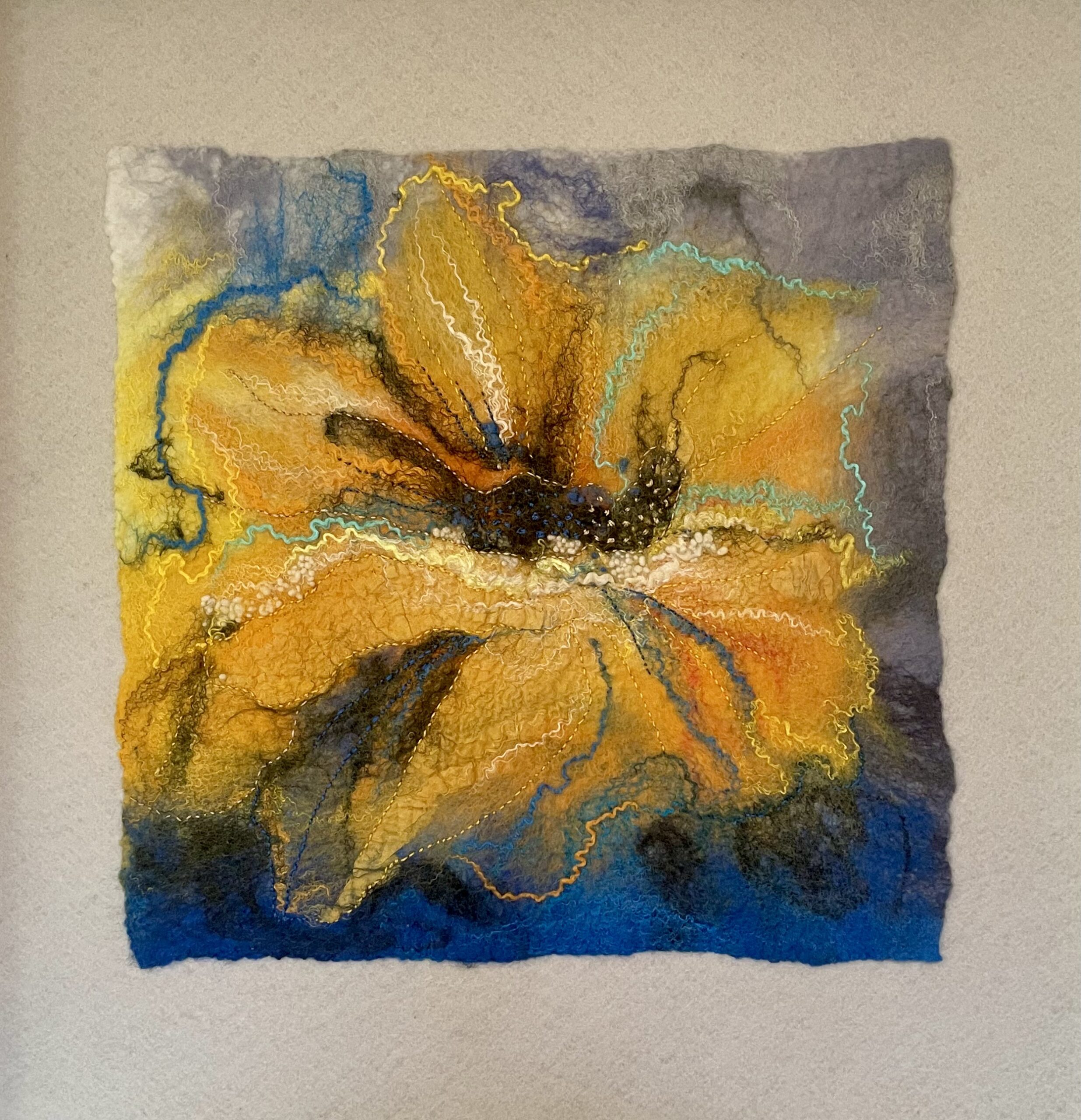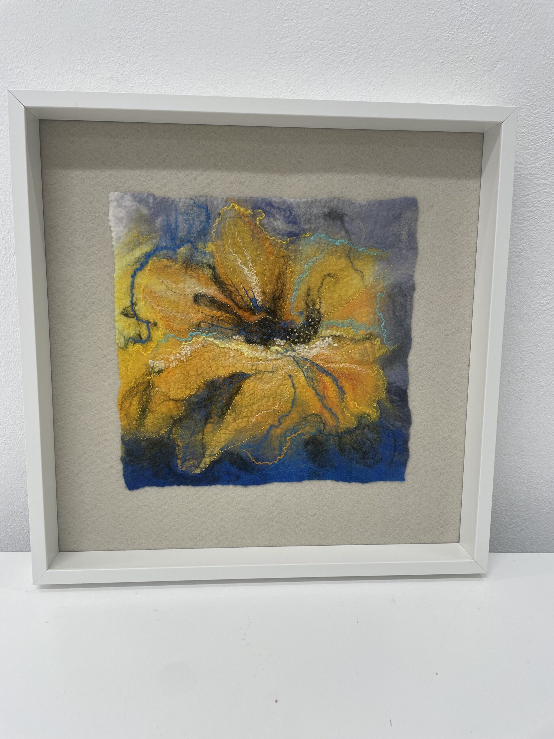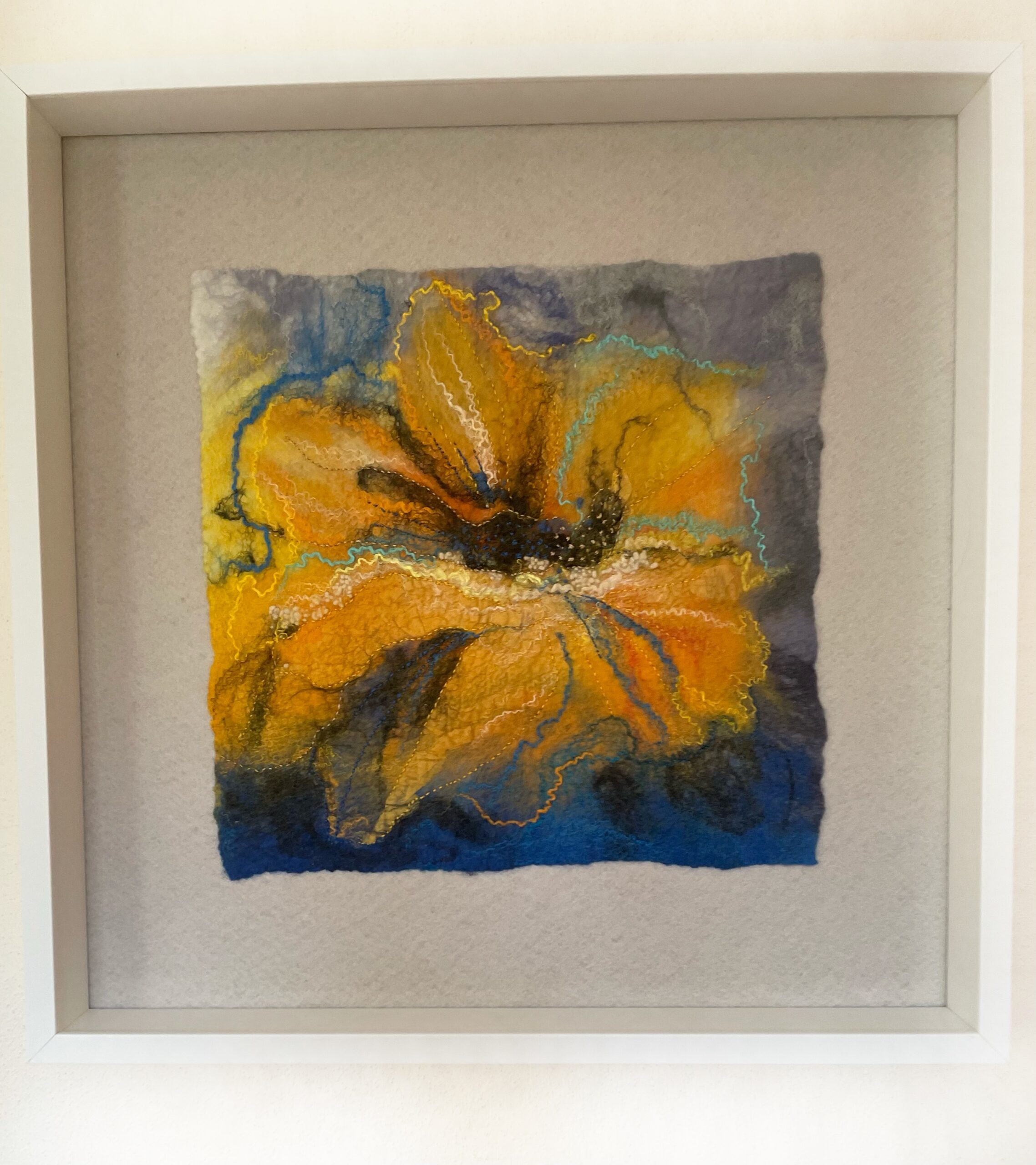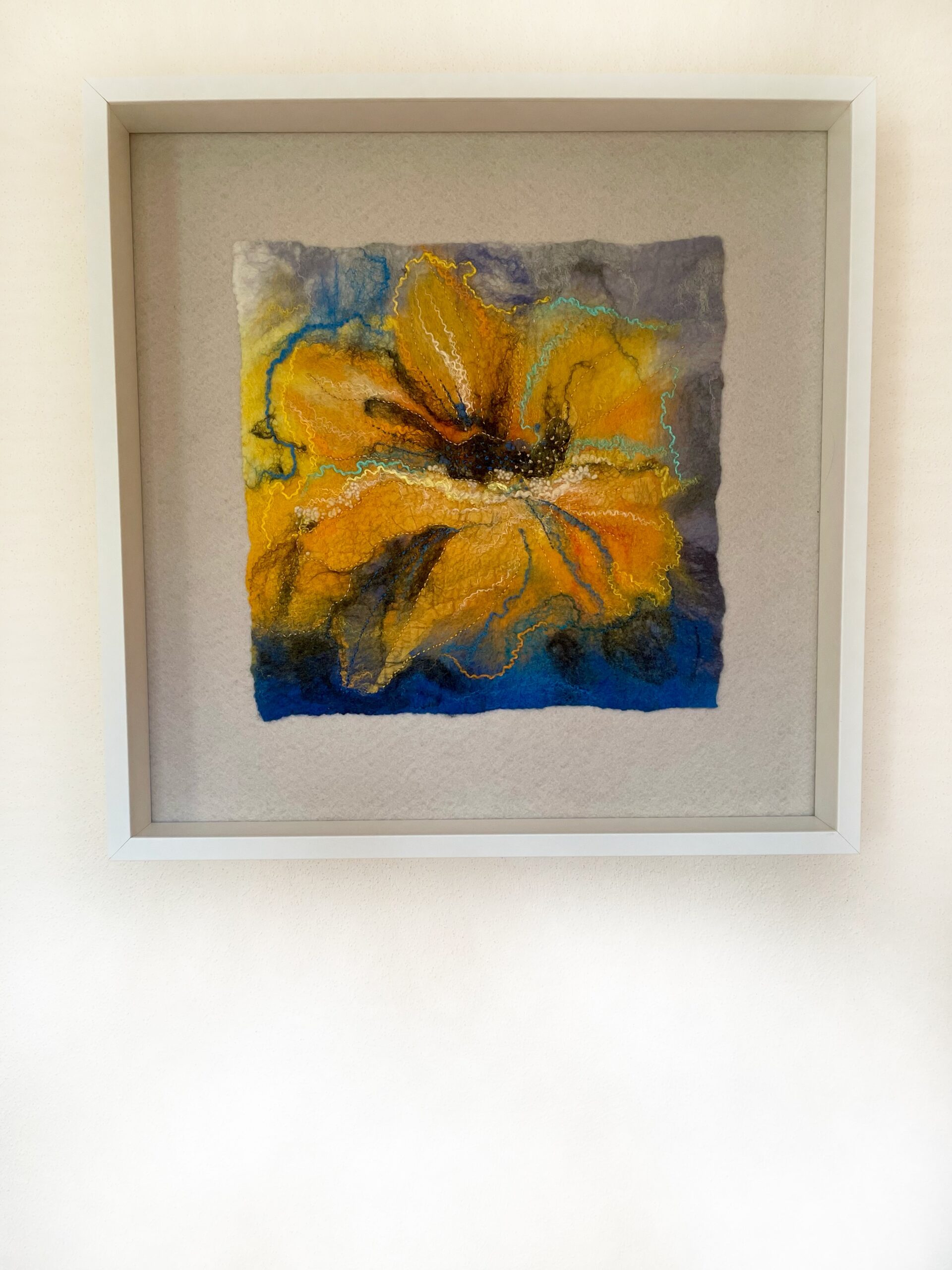 Toto textilní umělecké dílo spojuje jemná vlákna a ruční výšivku do harmonické kompozice. Žluté tóny vnášejí do prostoru pocit světla a radosti. Plstěné vrstvy a textura merino vlny vytvářejí hloubku a měkký reliéf. Diváka zvou k vizuálnímu i hmatovému prožívání. Neutralita filcového podkladu a bílý dřevěný rám zvýrazňují čistotu výrazu a eleganci celkového pojetí.